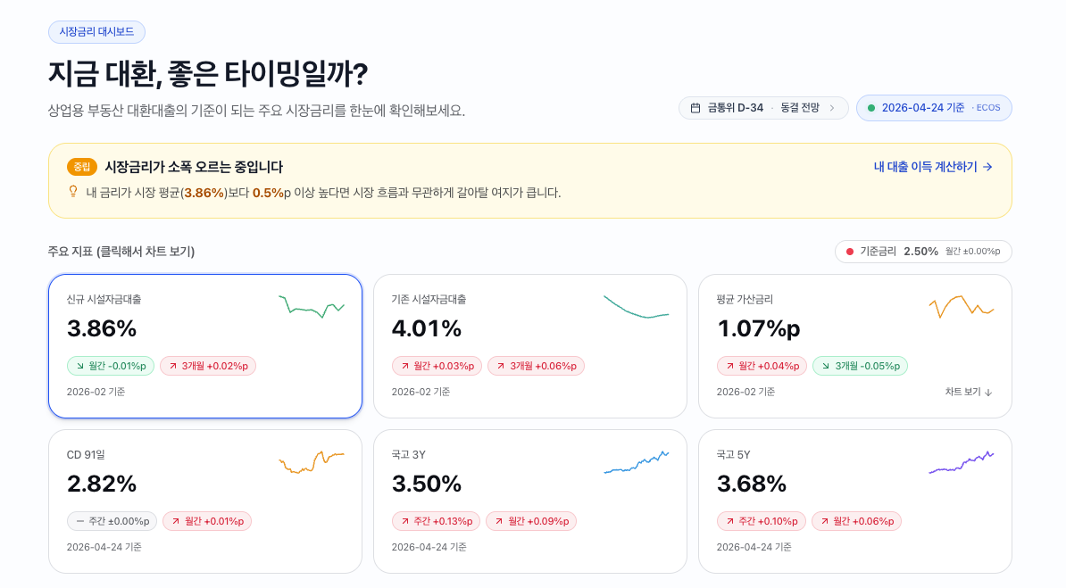 그래서 건물주 입장에서 "지금 대환 타이밍인지 아닌지"를 바로 확인할 수 있는 페이지를 추가했어요.